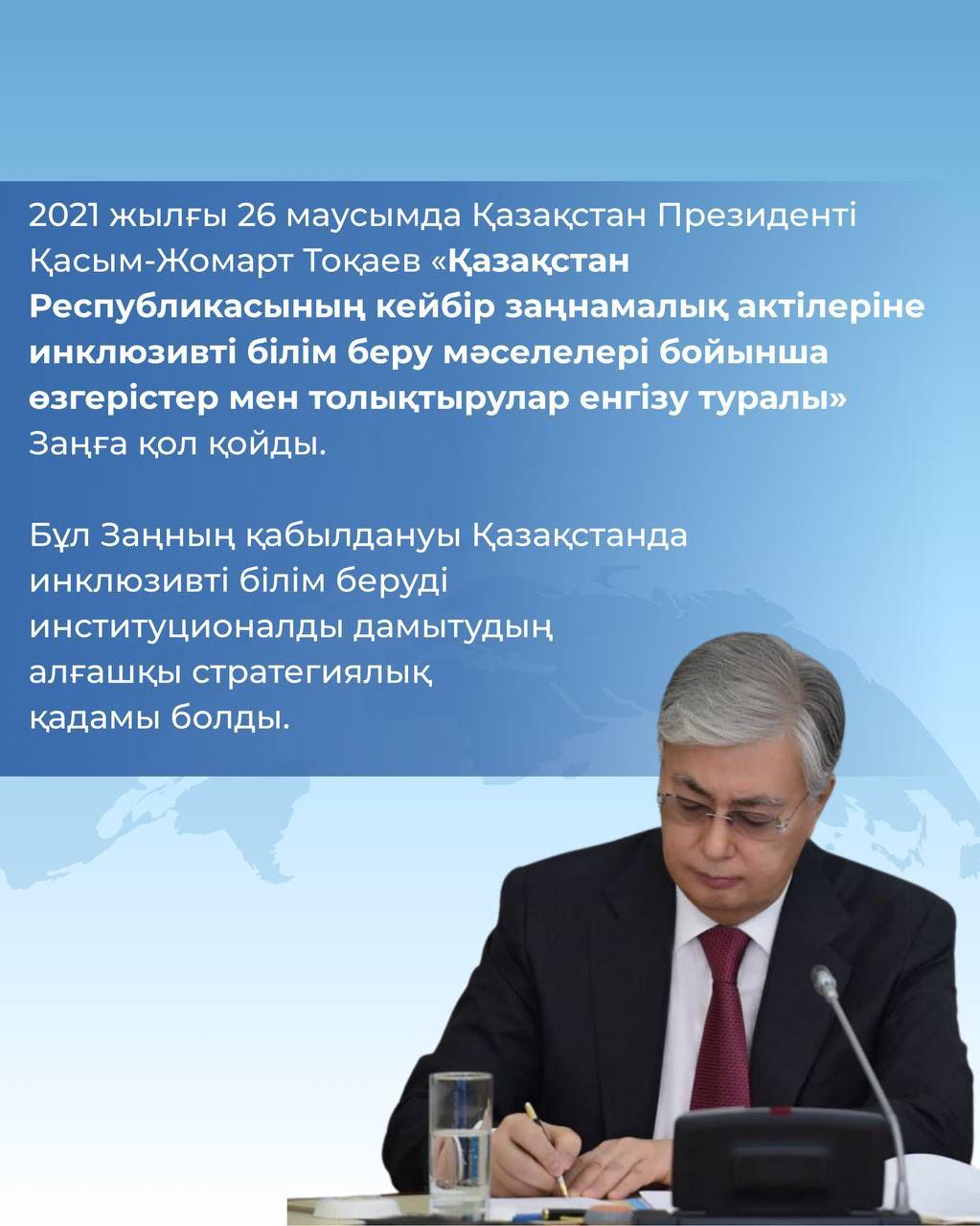 2021 жылы «Инклюзивті білім беру мәселелері туралы» заңға енгізілген өзгерістер бұл бағыттағы жұмысты жүйелендірді. 2023 жылы қабылданған екі инклюзивті пакет арқылы ерекше қажеттілігі бар азаматтарды қолдау шаралары нақтыланды. «Мүмкіндігі шектеулі балаларды кешенді қолдау туралы» жаңа заң жобасы күні кеше ғана Үкімет отырысында мақұлданды.